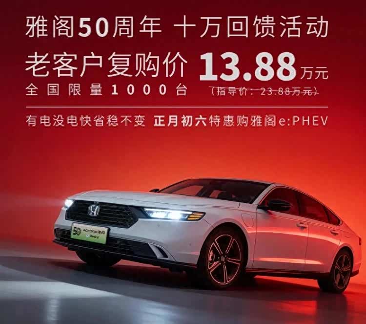 2月春节假期期间,广汽本田突然发布“王炸”消息。轱辘哥获悉,为了庆祝雅阁诞生50周年,广汽本田官宣老客户复购雅阁e:PHEV车型只需13.88万元,相比原价23.88万元直接便宜了10万元!不过,仅限量1000台发售,老车主会不会抢破头?