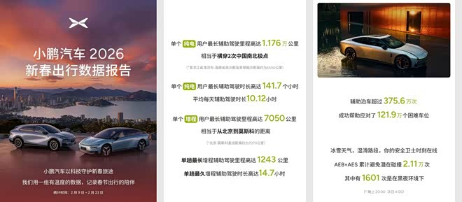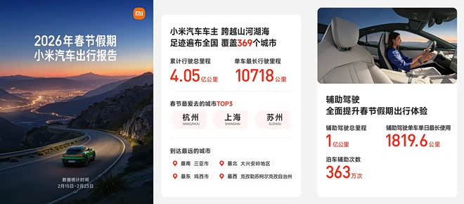 随着2026马年春节假期结束,华为乾崑、小鹏汽车、小米汽车、蔚来汽车相继发布新春出行数据报告。
