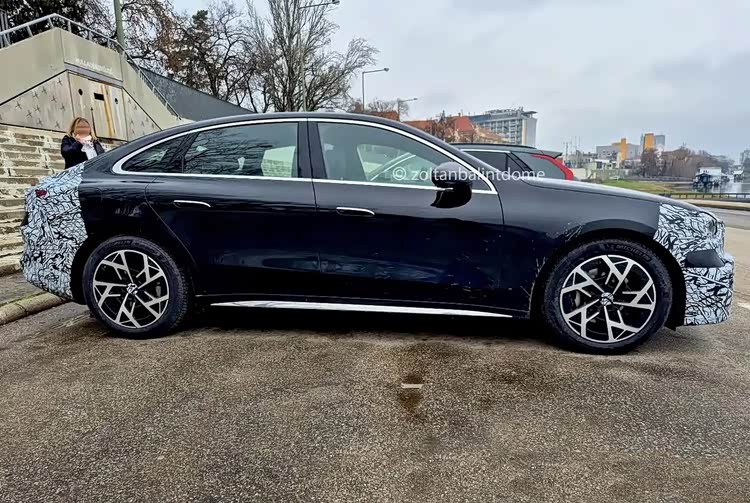 来到侧面,我们同样也能明显能感受到类似于EQS的设计理念,腰线流畅舒展,并配备有隐藏式门把手。与此同时,新车还采用了长轴距、短前后悬的设计,侧面车窗也有着不错的视野,并用上了独立式的三角窗,这点很不错。此外,全新样式的轮圈看上去相当动感,单就下图这个侧后45度的角度来看,整体的质感还是非常强的。