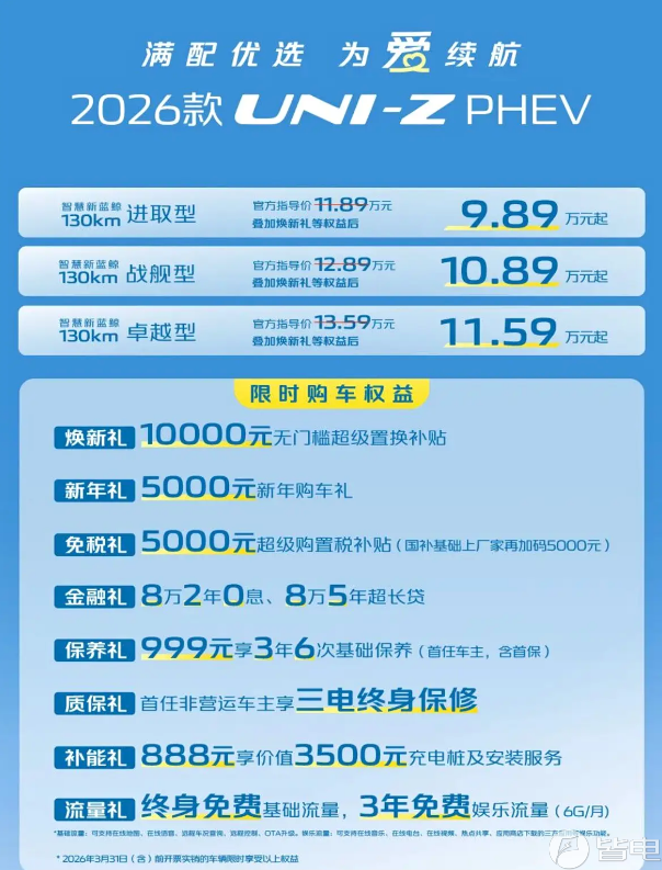 2026款长安UNI-Z PHEV上市!配AI语音大模型 权益价9.89万起