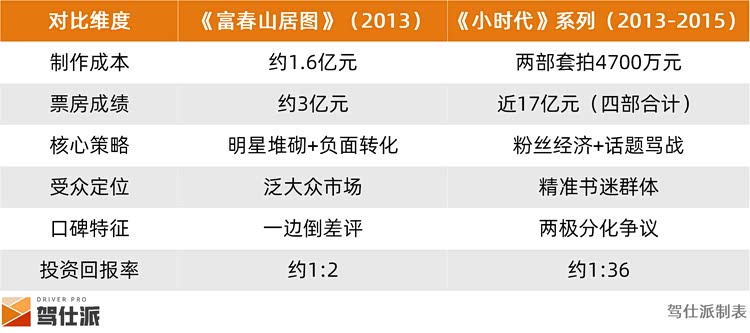 很巧的是,2013年可谓是“电影饱和式营销”的元年,那一年还有《小时代》1、2部,郭敬明用4800万投资撬动了8亿元的票房,甚至超过了《钢铁侠3》。而《小时代》的成功也一直延续了四部,整个系列票房高达17亿。