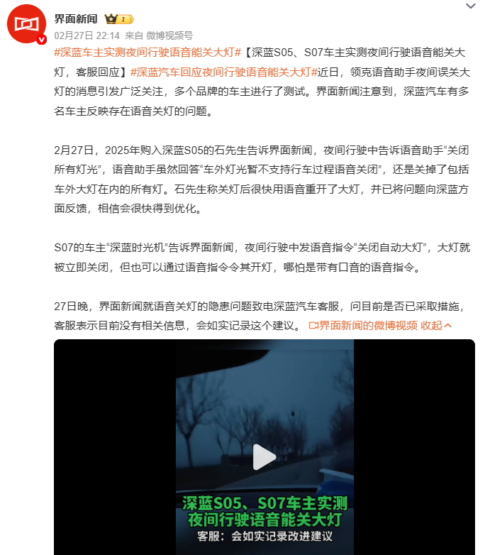 据界面新闻消息,深蓝S05车主石先生在2月27日实测发现,当他发出“关闭所有灯光”的指令时,语音助手虽然清晰地回答“车外灯光暂不支持行车过程语音关闭”,车辆却在一秒内陷入了黑暗——大灯被实实在在地关闭了 。