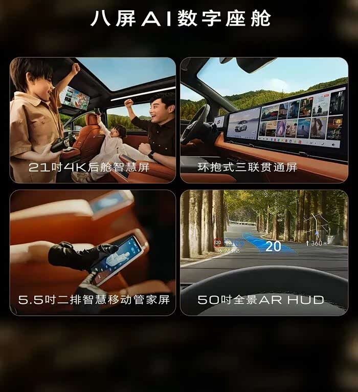 内饰方面,此次并未看到正式的官图,不过官方曝光了一些细节,我们来猜测,整体设计延续插混版车型的大体设计,座舱配备高通8775芯片,支持车内8屏互动,包括50英寸的全景AR-HUD、21英寸4K后舱多媒体智慧屏以及二排双5.5英寸智慧移动管家屏,支持多屏互动。AI大模型语音助手可完成超700项车控指令,支持连续对话与跨领域信息服务。