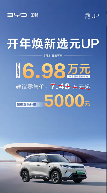 日前,我们从比亚迪官方获悉,在比亚迪王朝网体系内, 元UP(参数|询价)此次推出限时政策,时间覆盖至3月31日,叠加5000元置换补贴后,入门版本价格下探至6.98万元区间。这一价格落点直接进入6万元级纯电SUV市场,对首次购车群体和家庭增购用户而言,决策门槛明显降低。从当前新能源市场结构来看,6万—8万元区间仍以微型电动车与小型两厢车为主,具备SUV车身结构、2620mm轴距以及401km续航能力的产品数量有限。元UP通过价格与配置组合,形成更完整的入门级产品结构。
