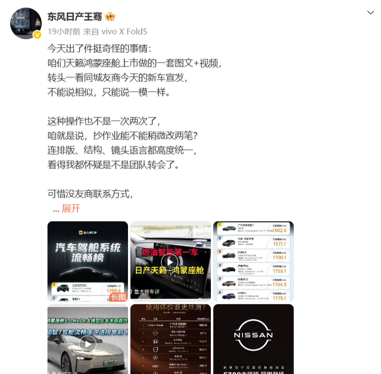 他直指“同城友商”在新车宣发上,几乎1:1复刻了 东风日产天籁(参数|询价)鸿蒙座舱上市的图文与视频物料。