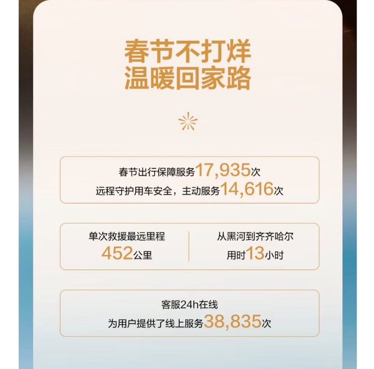 春节期间,问界共提供出行保障服务17,935次;远程守护用车安全,主动服务14,616次,将许多潜在故障消弭于无形。客服中心24小时在线,为用户提供了线上服务38,835次。为保障用户在遭遇紧急情况时能获得及时且高效的援助,问界服务网络展现了强大的跨区域协同能力,单次救援最远里程452公里,从黑河到齐齐哈尔用时13小时,树立了新豪华服务标杆。