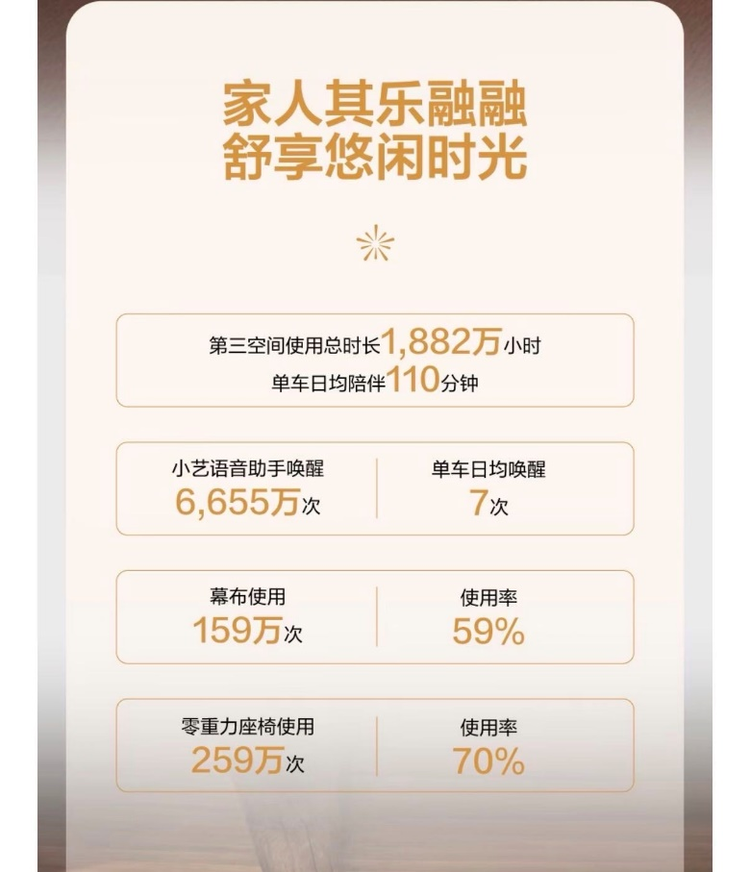 行无界,爱有家,春节期间,问界智能座舱化身温馨的“第三空间”,用户累计在第三空间使用总时长1,882万小时,单车日均陪伴110分钟。其中,智能语音助手“小艺”被唤醒6,655万次,单车日均唤醒7次。幕布使用159万次,使用率达59%,零重力座椅累计使用259万次,使用率高达70%。