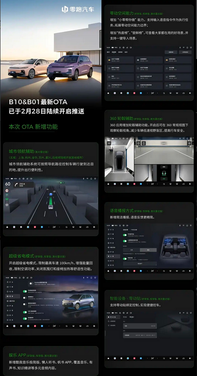 日前,我们从零跑汽车官方获悉, 零跑B10(参数|询价)与B01车型已陆续开启新一轮OTA远程升级推送。本次升级覆盖激光雷达版以及舒享版、悦享版等不同配置车型,功能新增与细节优化同步推进。从更新内容来看,升级方向并未停留在界面层面,而是围绕城市通勤、能耗控制、泊车辅助与座舱交互等高频使用场景展开,属于一次面向日常驾驶体验的系统层级调整。对于已经提车的用户而言,远程升级意味着无需进店即可获得功能扩展,这种以软件迭代补充硬件能力的方式,正在成为智能电动车使用周期内的重要组成部分。