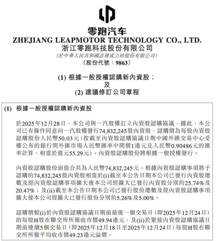 一汽这次是什么情况?2025年12月,一汽掏了37.44亿真金白银,以每股50.03元的价格,认购了零跑7483万股内资股,算下来只占零跑总股本的5%,连个董事会席位都没拿到,更别说插手零跑的日常运营了,完全够不上财务并表的边。