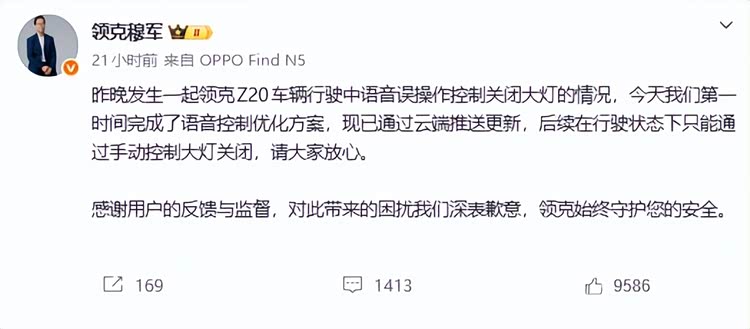 好在领克这次的反应,确实没得黑。事发当天,领克汽车销售有限公司副总经理穆军就直接站出来发声了,没有甩锅给车主口音,没有找一堆技术借口,先坦坦荡荡认了问题,为给用户带来的困扰道了歉。更关键的是,从事故曝光到高管发声,再到把优化方案通过云端OTA推送给所有车主,全程没超过24小时。优化后的逻辑很简单:以后车辆在行驶状态下,大灯只能通过手动控制关闭,语音彻底碰不了这个核心权限。