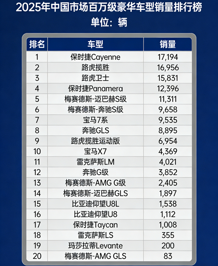 据不完全统计,目前可以确认的是,2025年百万级豪华车型的前二十排行榜中,出现了两款中国产品的身影,分别是来自仰望品牌的 仰望U8(参数|询价)、仰望U9两款产品,虽然排名不高,但却是十分难得。事实上,除了对于指导价严格限制在百万以上的产品外,还有平均成交价近百万的产品,也有不俗的销量表现,其中以尊界S800最为出彩,累计销量已经突破万台。值得注意的是,尊界S800于2025年年中才开始正式交付,也就是说它仅用时半年便来到了百万级产品年度销量的第一梯队,如果以月均销量计算,它的月销量处于妥妥的前三选手。
