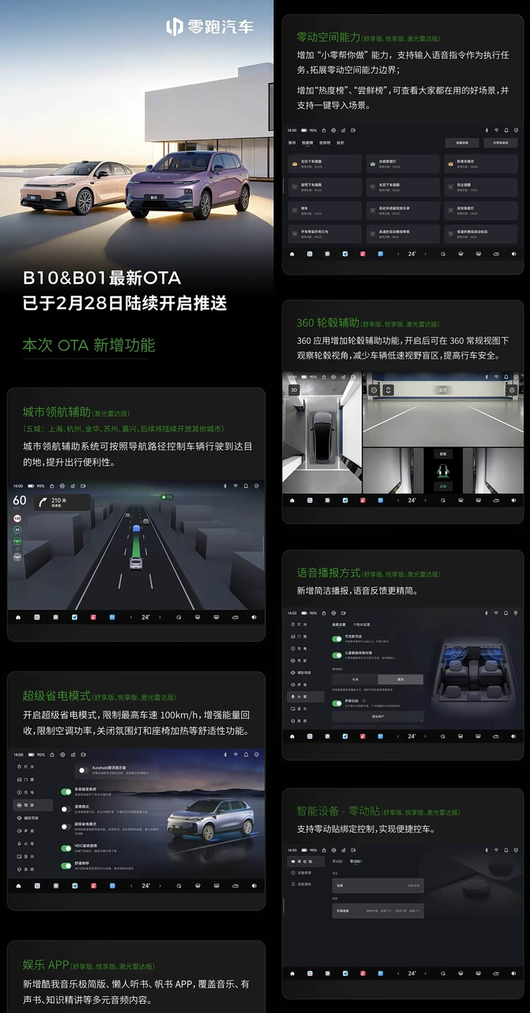 2月28日,零跑汽车正式启动了针对B10和B01车型的OTA升级推送。这次更新为部分车型引入了城市领航辅助功能,同时增加了超级省电模式、新的娱乐应用以及360轮圈辅助等实用配置。此外,也对已有的通勤领航辅助、记忆泊车和语音控制系统进行了细节优化。