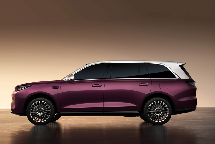 车身尺寸长宽高分别为5299/2025/1825mm,轴距3150mm,相比同级极氪9X、问界M9、理想L9等更大一些。庞大的身躯配合立体的线条勾勒,给人感觉很有气场,且不乏肌肉力量感,而金/紫双拼色车身,配合车窗四周镀铬饰条点缀、21英寸密幅式轮毂等,也进一步提升了豪华气息。多层次感的尾部造型与整车风格相得益彰,贯穿式尾灯也与前脸相呼应,并加入有“智驾小蓝灯”。