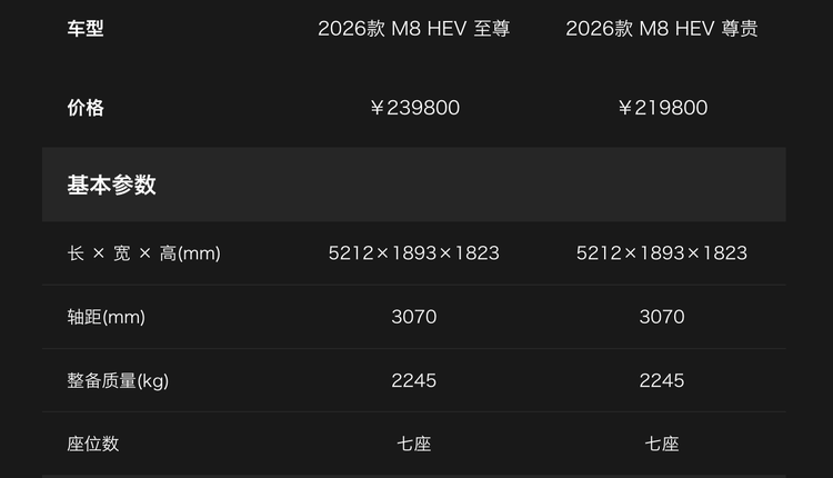 近日,广汽传祺正式推出2026款M8 HEV车型,作为年度改款车型,新车定位中大型MPV,主打商务与家用双重场景,共推出2款配置版本,售价区间21.98-23.98万元,即日起开启全国预订,预计3月中旬批量交付,同步推出置换补贴政策,置换用户可享最高1万元补贴,进一步提升产品竞争力。