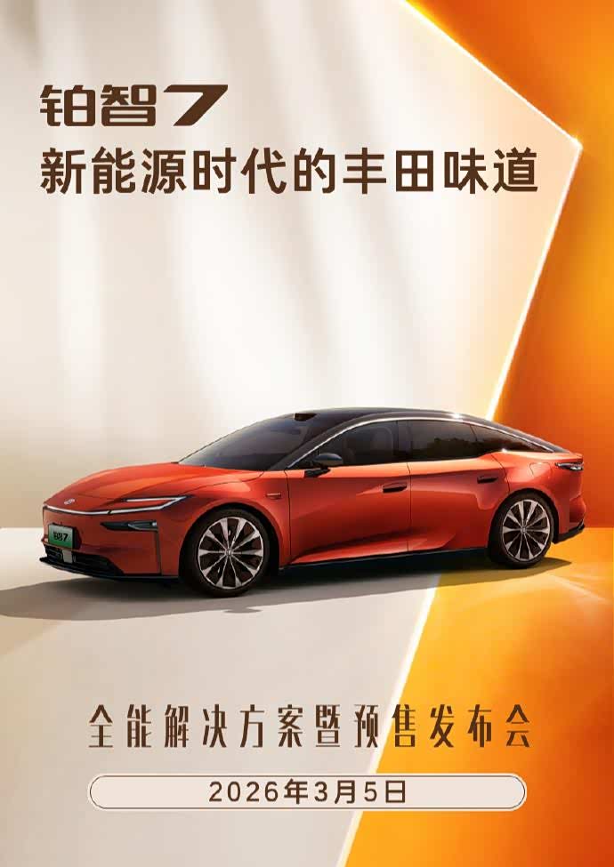 车家号·0浏览·2026-02-28 17:05 · 北京2月27日,广汽丰田宣布旗下全新纯电旗舰轿车——铂智7将于3月5日开启预售。新车定位为中大型车,此前已在2025上海车展亮相。
