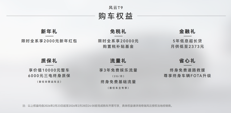 为让更多家庭轻松拥有这款新豪华中型电混SUV,风云品牌推出限时重磅购车福利,购车即可享受全系2000元新年红包、20000元购置税补贴基金,还有5年低息超长贷,月供低至2373元,大幅降低购车门槛。同时,还有价值10000元整车+6000元三电终身质保、3年免费娱乐流量+终身免费基础流量、终身免费道路救援+终身车辆FOTA升级等多重福利,真正实现“买车省、用车省、养车更省”,让家庭购车用车全程无忧。