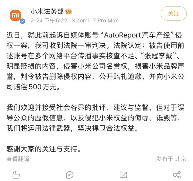 2026年2月24日,小米诉自媒体“AutoReport汽车产经”一审获赔500万元、尊界诉自媒体“赛车星冰乐”一审获赔30万元两起判决正式落槌。恰逢中央网信办“清朗·2026年营造喜庆祥和春节网络环境”专项行动推进期间,这两起案件正是整治网络“黑嘴”、打击虚假信息的实效体现。