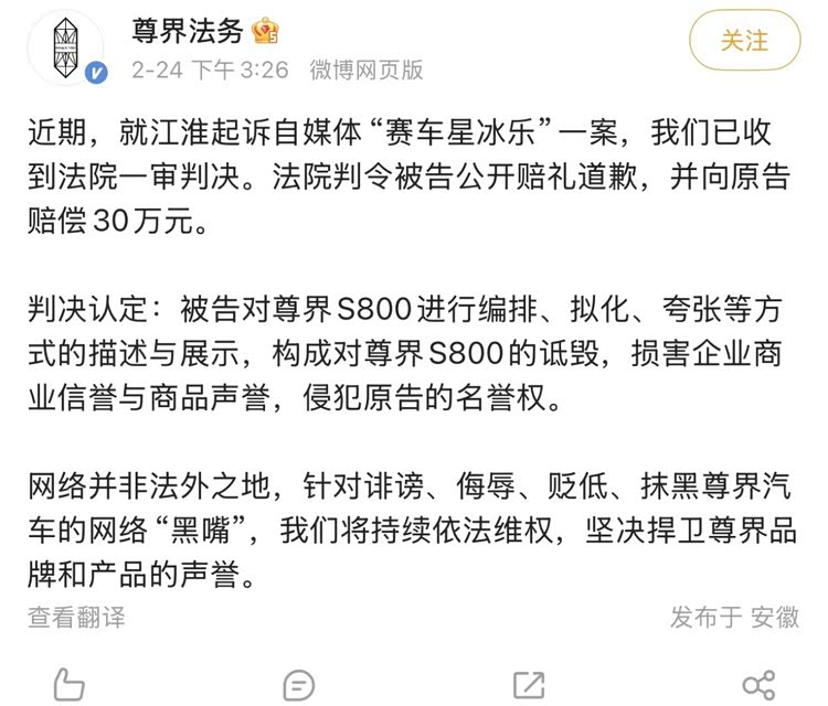 法院审理查明,两个涉事账号均存在恶意抹黑、失实诋毁车企的行为,早已超出正常舆论监督范畴。其中,“AutoReport汽车产经”长期发布针对小米汽车的不实贬损内容,事实核查严重缺失;“赛车星冰乐”更是早有“案底”,2025年11月就因恶意抹黑车企被国家网信办公开通报,其针对尊界产品的诋毁行为被法院依法认定,其反诉索赔250万元的主张也未获法院支持。