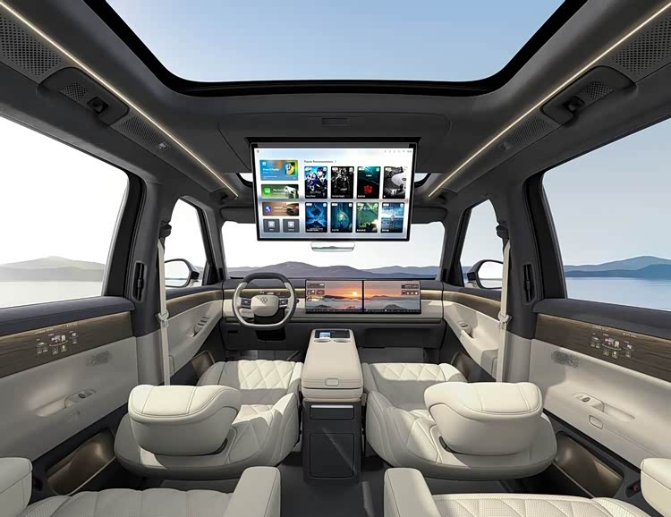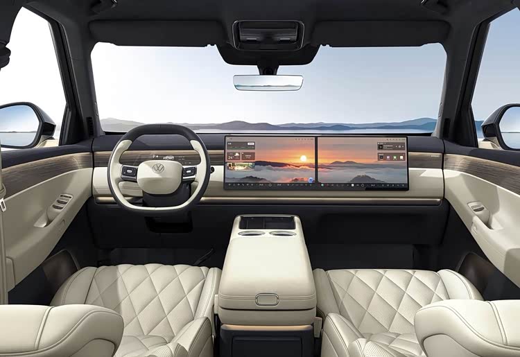 内饰方面,ID. ERA 9X采用“方圆合蕴”设计理念,融合东西方元素,座舱为一体环抱式结构。中控台与门板经过立体解构和悬挑处理,既区分了功能区域,也让车内空间更显通透。全车氛围灯总长12.8米,采用四层环舱布局,配合漫反射光学技术,光线分布均匀柔和。