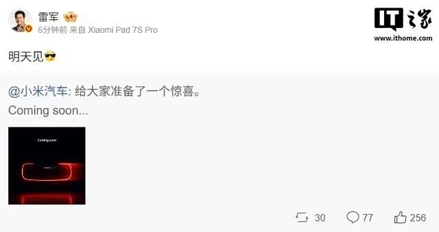 2月28日消息,小米汽车今日预告:“给大家准备了一个惊喜。Coming soon..”。