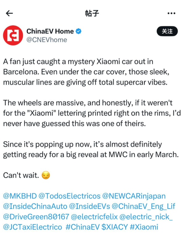 小米神秘跑车现身巴塞罗那 或为MWC 2026展示做准备