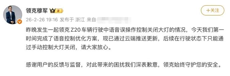 事故发生后,领克的反应不可谓不迅速。24小时内,副总和公关团队迅速到位,道歉信措辞诚恳,并立即推送了OTA升级,将大灯控制权从语音手中夺回,改为只能手动控制。危机公关的“领克速度”确实令人印象深刻。但这种“快”,非但没能让人感到安心,反而让更多人后背发凉:既然这个问题能在24小时内修复,为什么不能在上市前的哪怕一次路试中被发现?