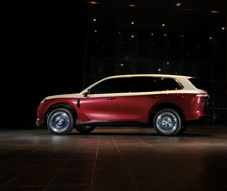 来到车身侧面,华境S炽焰鎏色最大的特点便是采用了迈巴赫同款的双拼车色,前舱盖、A柱、弧线形车顶以及D柱都加入了香槟色的涂装,车身加入了红色的车漆涂装,两种颜色在肩线巧妙的拼接在一起,外凸式的前后轮眉与优雅婉转的腰线融为一体,更加灵动。前翼子板处加入了直立式的挖孔槽设计,黑色的宽体侧裙与内侧的拱形轮眉连接在一起,并配备了21英寸的锅盖样式的封闭轮圈,中间还加入了重力感应式的轮组盖,匹配了265/45 R21规格的米其林PiLot Sport 4静音轮胎,强调静音性能与操控表现。车内采用了实用性很强的6座布局。尺寸方面,该车的长宽高5235/1999/1800mm,轴距3105mm。整车重量2470kg,最大满载重量3045kg。