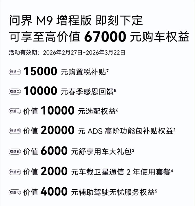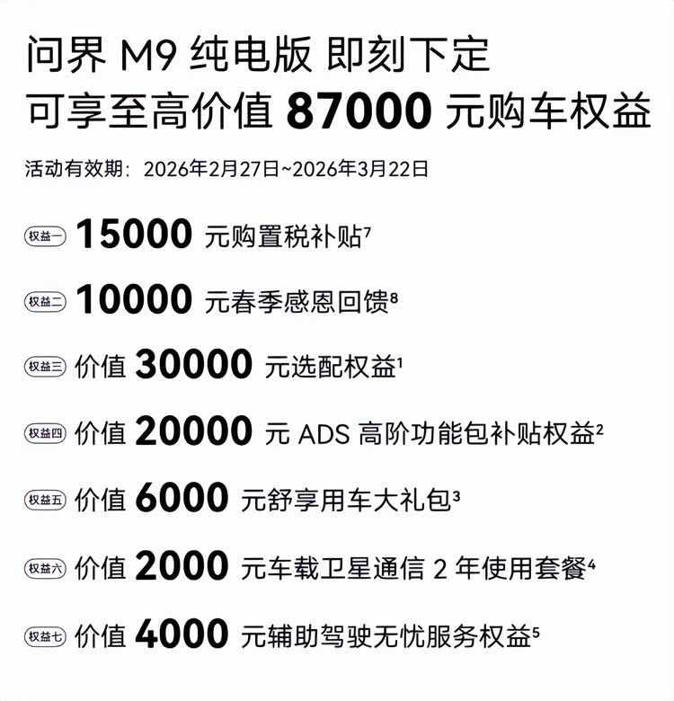 如今,马年新春已过,但问界M9的暖情福利回馈仍在延续,为了让更多家庭体验到科技豪华的出行生活,问界M9推出限时购车重磅礼遇。2026年3月22日前,下定问界M9至高可享87000元购车权益,涵盖购置税补贴、春季感恩回馈、ADS高阶功能包补贴、车载卫星通信2年使用套餐等多重礼遇。