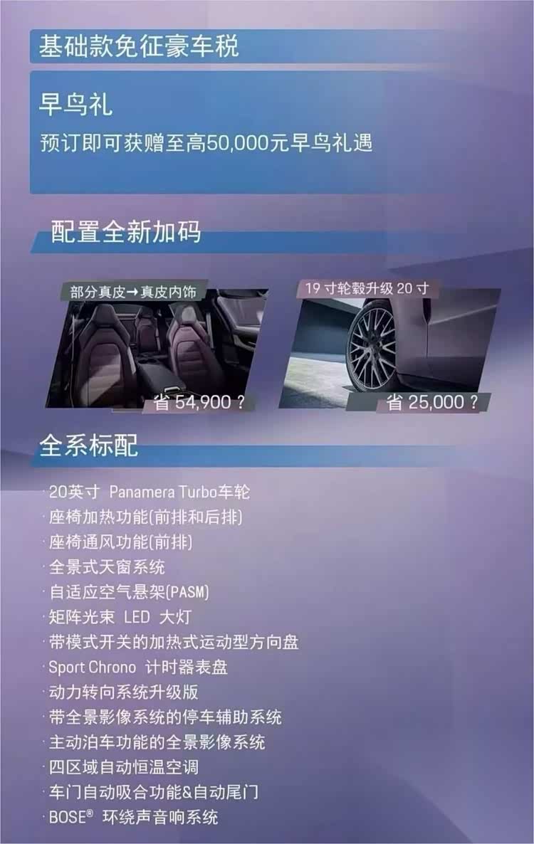 保时捷终于低下了高傲的头!根据最新消息,新款 帕拉梅拉(参数|询价)即将迎来史上最大力度配置升级与价格调整。以往需要花大几万选装的豪华套件、四驱空调、Bose音响等实用配置,现在直接变为基础版标配。更关键的是,基础版定价将巧妙避开豪车税,这意味着曾经遥不可及的百万级Dream Car,落地价有望首次跌破一百万大关。