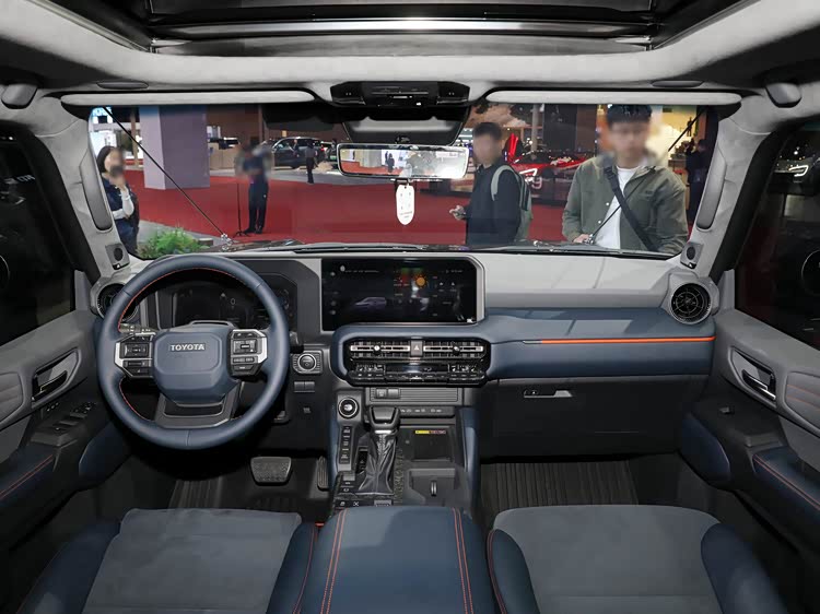 内饰走的是越野车的实用路线,简洁直接。物理按键保留很多,中锁、低速四驱、高速四驱一键切换,操作简单不用研究。副驾驶前方和B柱位置有抓手设计,这种细节是真正懂越野用户需求的体现。座椅采用真皮包裹,宽大柔软,前后配双层玻璃隔音效果好。前排标配座椅加热,后排有手机充电接口,坐起来比老款舒服了不少。中控布局合理,新手上车不需要适应期,上车就能用,丰田在这一点上一直很稳。