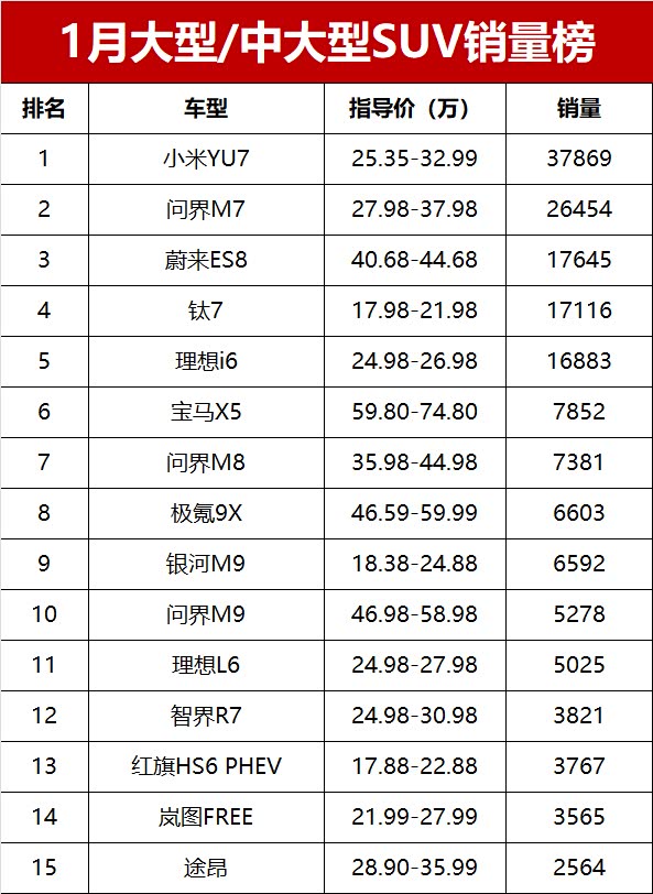 整体来看,2026年1月的大型和中大型SUV市场,已经彻底进入自主新能源主导的新时代。曾经靠品牌溢价、燃油技术站稳脚跟的合资、豪华品牌,在空间、智能、能耗全面占优的自主品牌面前,优势正在快速消失。