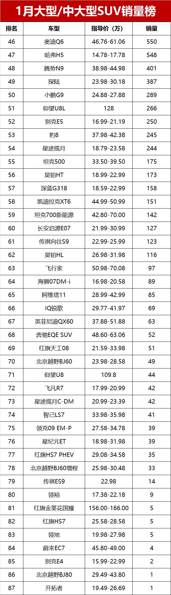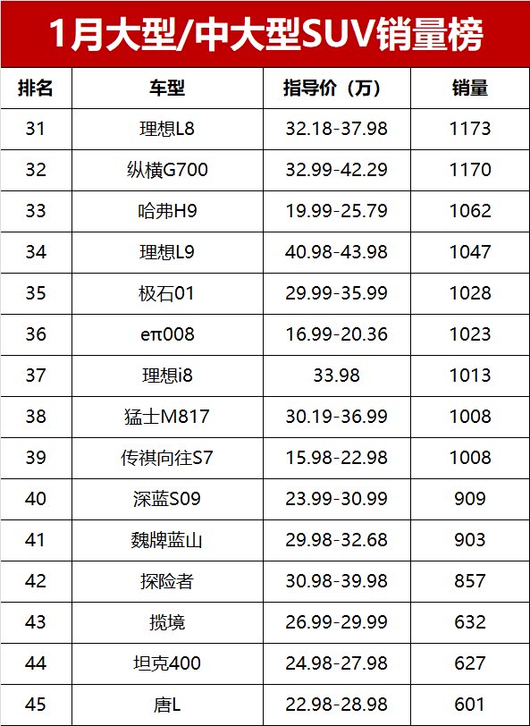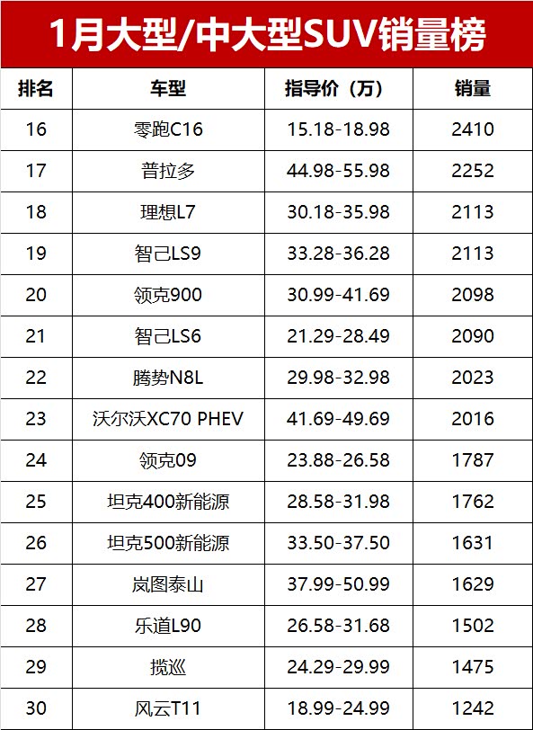 往下看,零跑C16、普拉多、理想L7、智己LS9、领克900等车型销量都在2000辆上下,其中普拉多作为经典硬派SUV,1月卖出2252辆,依旧有不少忠实粉丝。而探险者、揽境、奥迪Q6、凯迪拉克XT6等曾经的热门合资、豪华车型,销量已经跌破千辆,和头部自主新能源差距巨大。