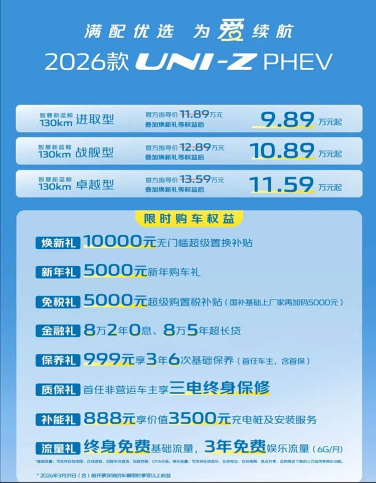 2026款 长安UNI-Z(参数|询价) PHEV刚一上市就炸了圈,9.89万的权益价起步,直接把十万级插混 SUV 的性价比卷到了新高度,作为看车多年的老炮儿,这波操作必须给长安点个赞。这款年代改款车型看着没大动外观,实则在核心体验上全是干货,对比比亚迪宋 Pro DM-i、银河星舰 7 EM-i 这些热门竞品,优势可不是一星半点。