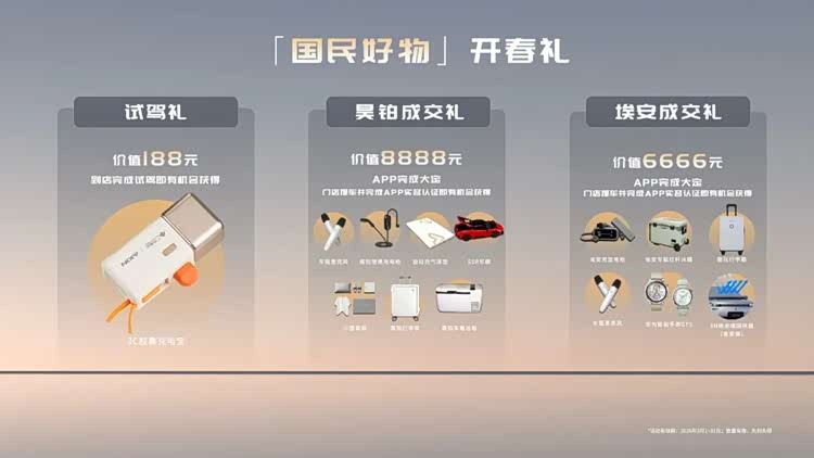 为庆祝IP发布与马年新春,3月1日-31日期间,用户到昊铂或埃安门店完成试乘试驾,即有机会获得价值188元国民好物试驾礼;通过APP完成大定并提车实名认证后,昊铂车主可享价值8888元成交大礼包,埃安车主可享价值6666元成交大礼包,含充放电枪、车载冰箱、华为智能手表GT5、3M隔热膜等实用好物,先到先得。