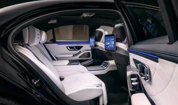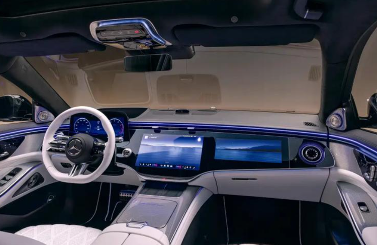 内饰部分,新车取消了老款的纵置中控屏,换成了和EQS同款的曲面联屏,由14.4英寸中控屏、12.3英寸裸眼3D仪表盘和12.3英寸副驾屏组成,中控下方保留了部分实体按键,方向盘按键模组也进行了更新。车内依旧搭配皮质、木纹和金属饰板,部分版本提供个性化内饰配色选择,后排配备两块娱乐屏幕,支持单独控制,座椅靠背和腿托可调节角度。