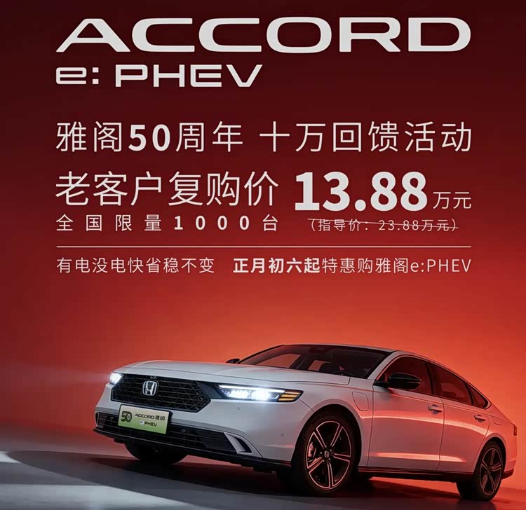 就连本田都顶不住了,雅阁e:PHEV推出了老客户复购价,原本23.88万元的车型,本田直接“官降”10万元,价格变成了13.88万元。不过需要注意的是,全国限量1000台。
