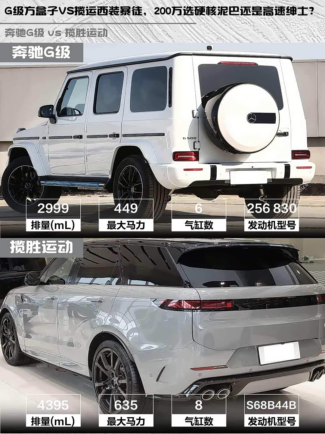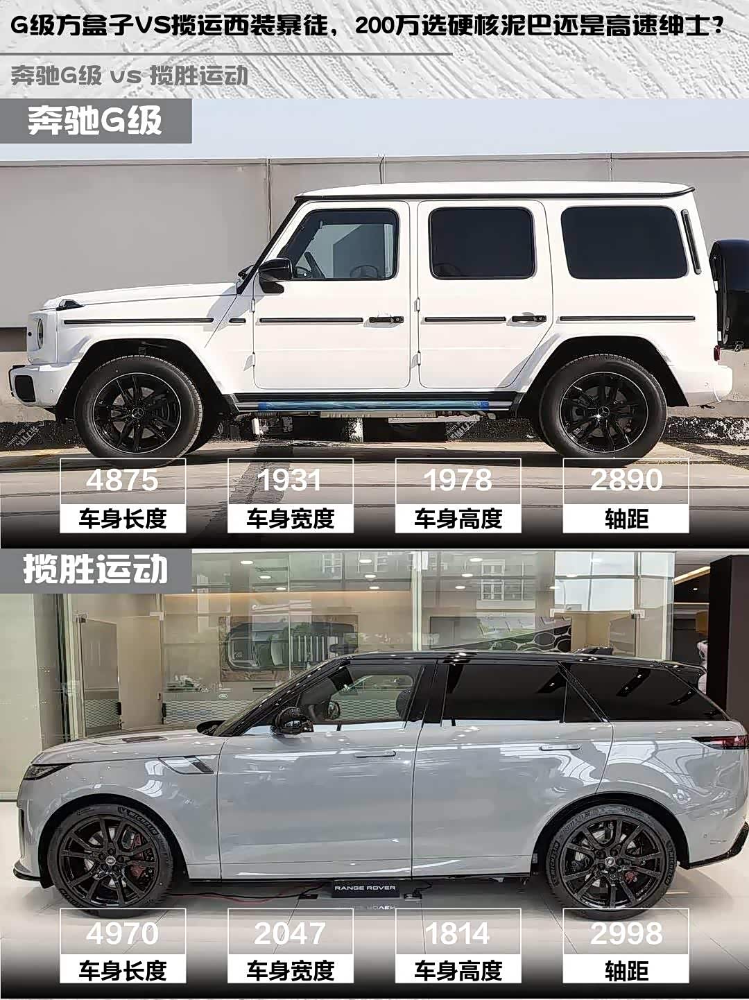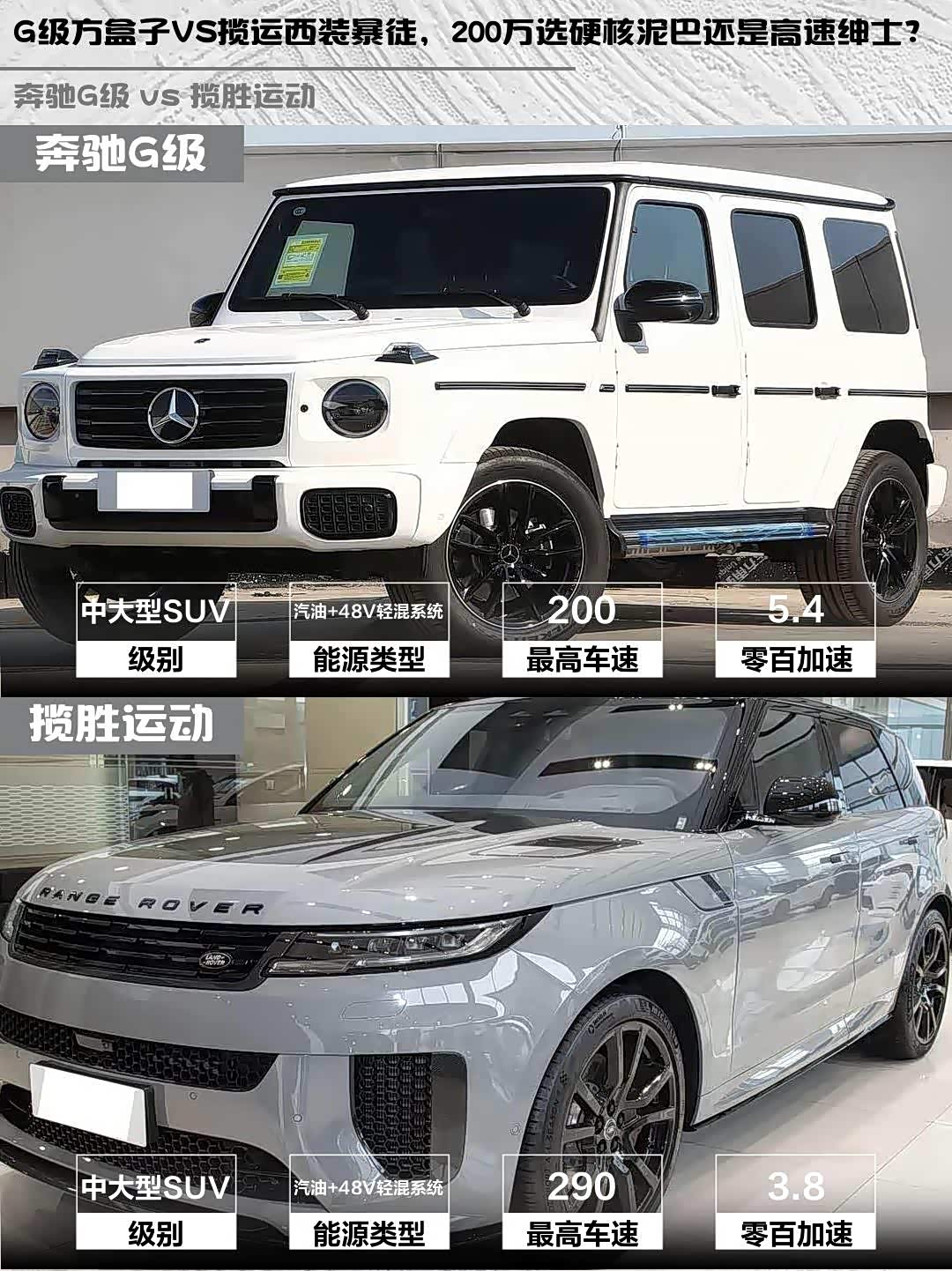 先看颜值!奔驰G级经典的方盒子造型+圆形大灯,北极白车漆配20寸轮毂,外挂备胎直接把硬汉氛围拉满💪。揽胜运动则是星云蓝涂装+23寸大脚,溜背线条像穿了西装的运动员,两种风格你们Pick谁?