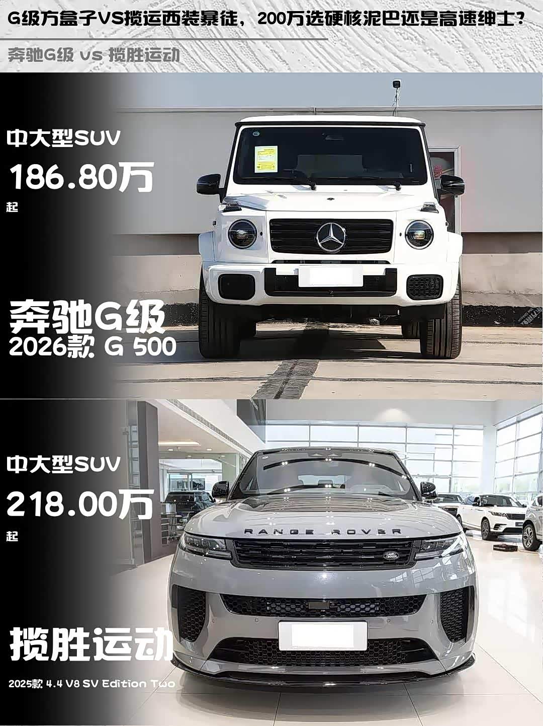 车家号·0浏览·2026-03-01 08:28 · 北京奔驰G级(参数|询价) 2026款 G 500 vs 揽胜运动 2025款 4.4 V8 SV Edition Two,200万级硬派越野和运动豪华的对决,谁才是你的Dream Car?🤔