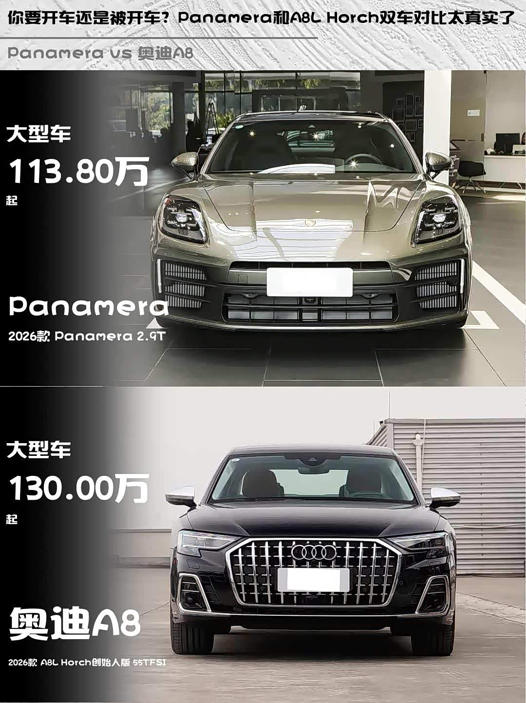 最近后台好多人在问:百万级行政轿车到底选运动王者还是舒适标杆?今天直接拉出2026款 Panamera 2.9T和2026款 A8L Horch创始人版 55TFSI硬核对比,看完保你不再纠结!🔥