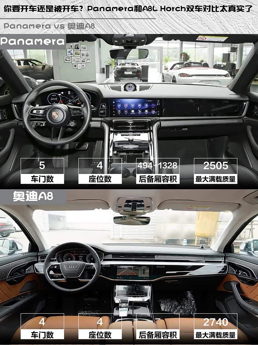 Panamera掀背造型帅是帅,但494L的后备箱放高尔夫球包都要斜着塞。A8L的5450mm车长不是白给的,后排轻松跷二郎腿不说,后备箱还能塞下7箱茅台!不过要吐槽下Panamera的门板储物格,连瓶矿泉水都放不下,手机永远在杯架和腿之间流浪...😅