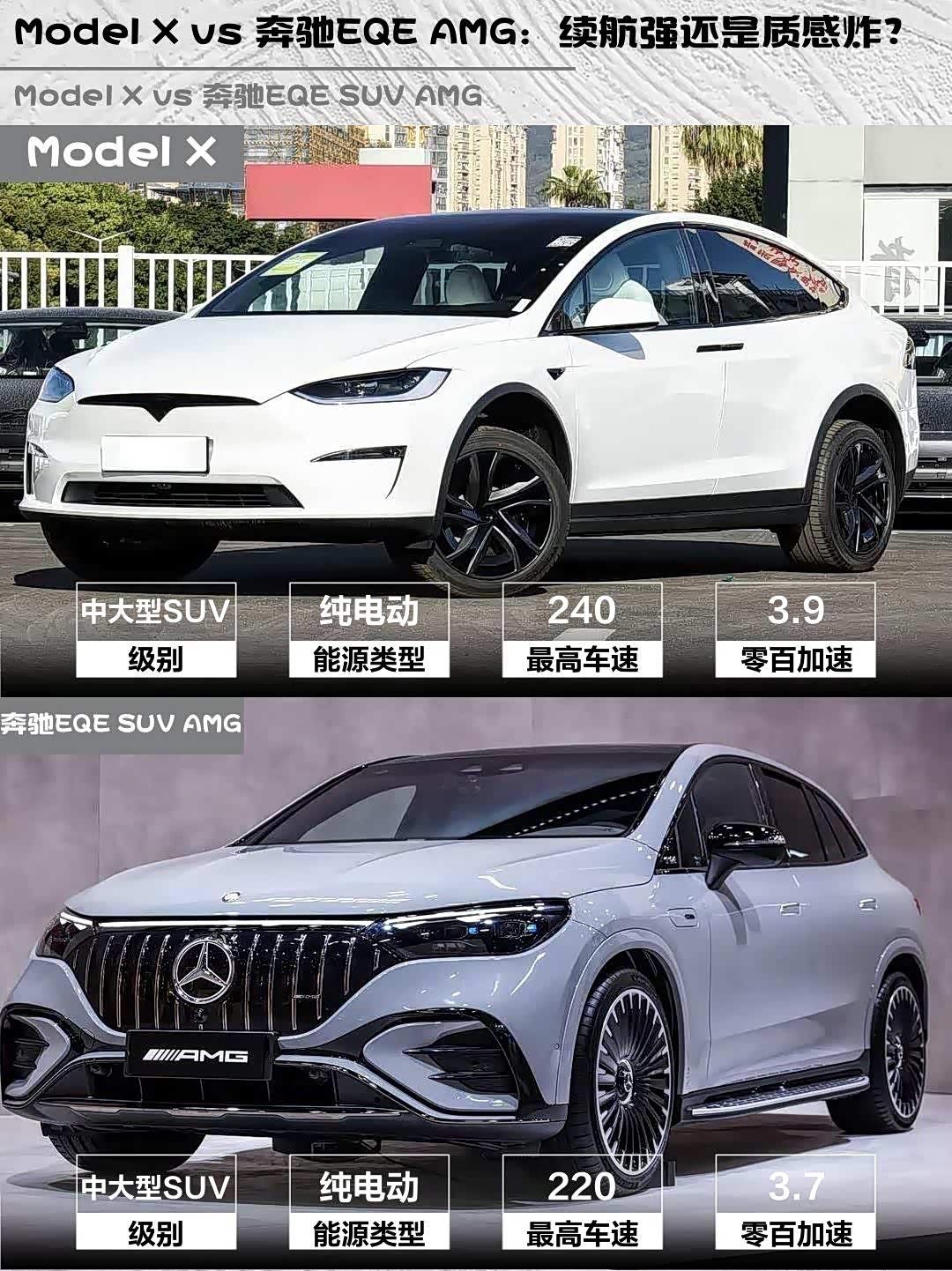 今天来聊聊两款百万级纯电SUV的硬核对比——特斯拉Model X 2026款双电机全轮驱动版 vs 奔驰EQE SUV AMG(参数|询价) 2024款EQE 53 4MATIC+!这两台车都是各自品牌的性能担当,但性格差异明显,看完你就知道该选谁了🔥