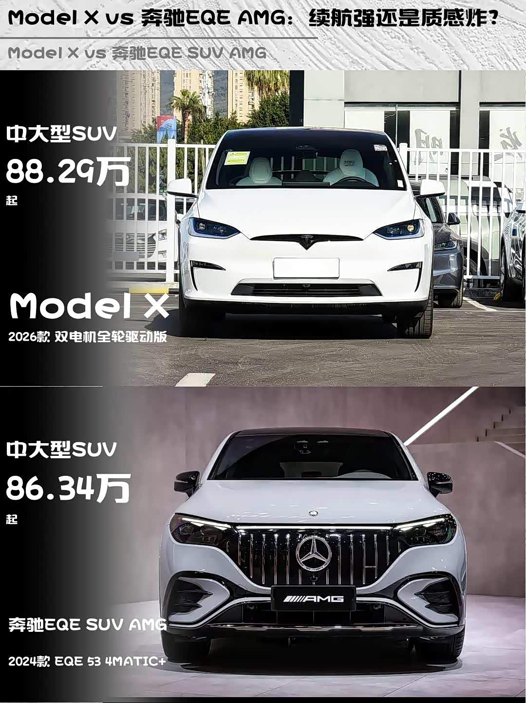 Model X卖88.29万,四年质保+超充网络是隐形福利;AMG EQE 53卖86.34万,三年不限公里质保+奔驰4S店服务更省心。要科技感和续航选特斯拉,要豪华质感与性能情怀选奔驰。偷偷说,AMG的保值率可能更稳哦💰