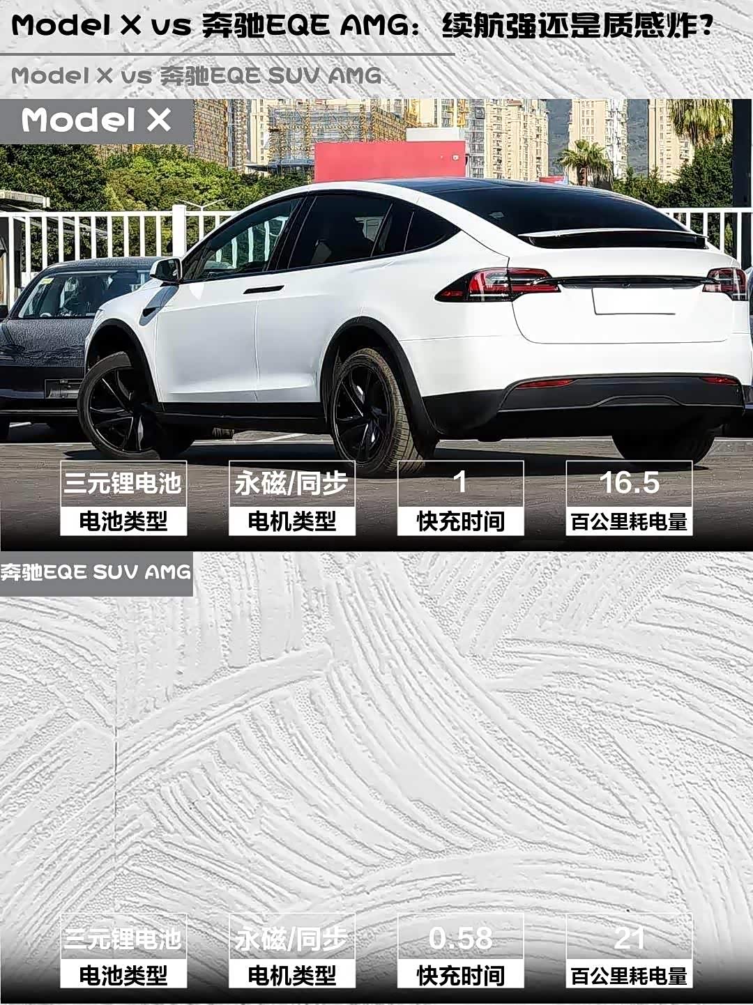 Model X双电机版3.9秒破百,601马力配上700km的CLTC续航,日常通勤+周末飙车两不误。AMG EQE 53更暴躁,3.7秒的零百加速配上626马力,但续航490km稍短。不过AMG的快充只要0.58小时,比特斯拉的1小时更高效⚡️ 开起来的话,Model X的加速像被弹射出去,而AMG那种电机+AMG调校的声浪模拟更有燃油车情怀。