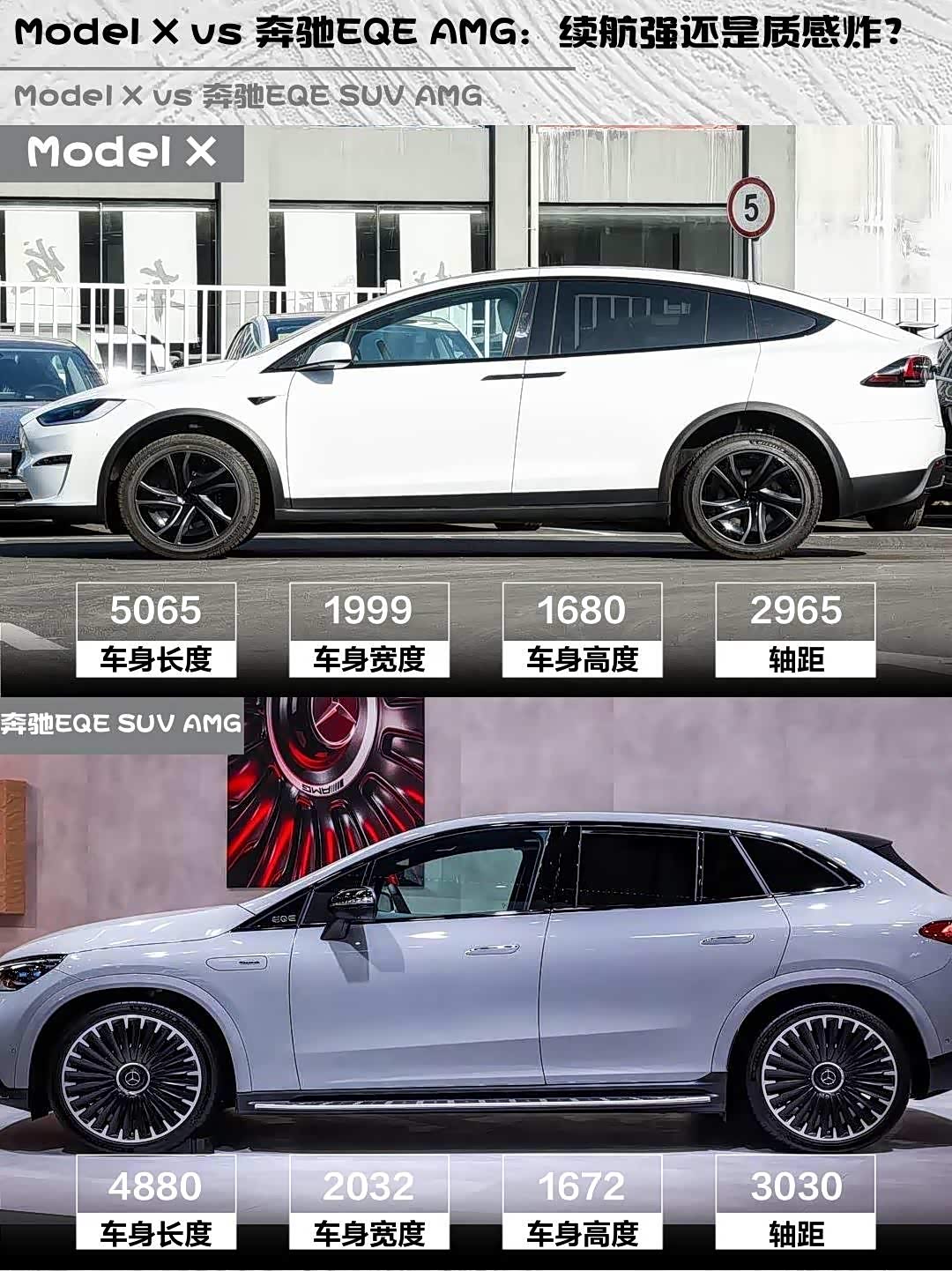 Model X的冰霜蓝/烈焰红车漆配上22寸大轮毂,开在路上就是科幻片主角。AMG EQE SUV的祖母石绿+曜岩黑更有西装暴徒的质感,风阻系数0.25比Model X的0.24略高,但车身更紧凑适合城市穿梭。