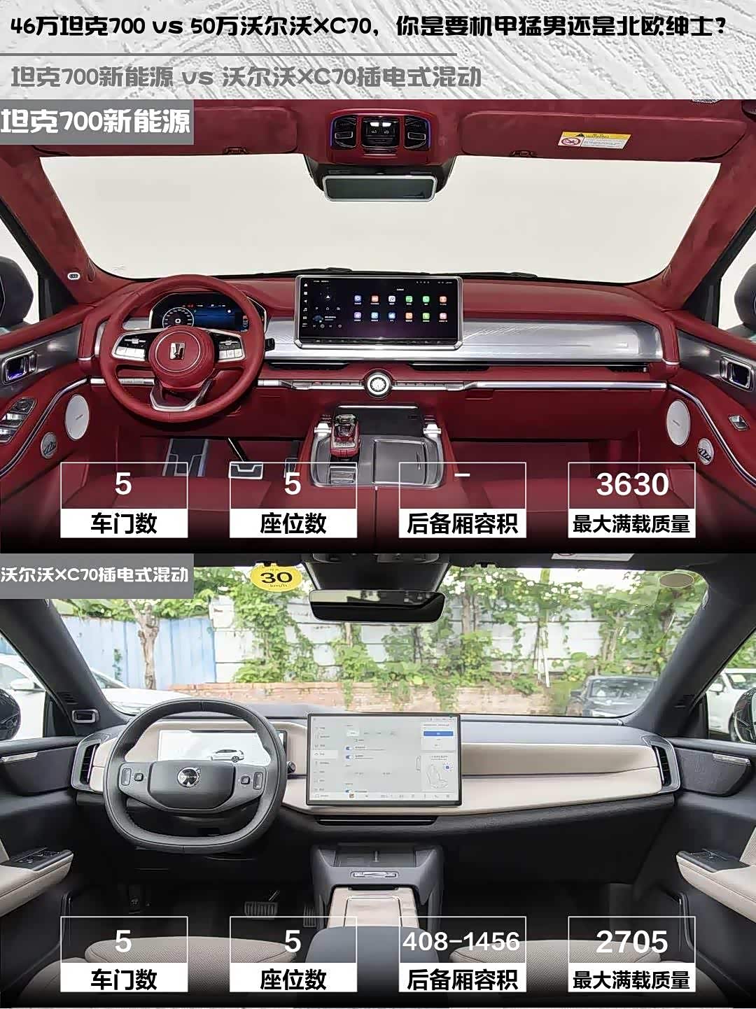 坦克700超5米的车长配上Nappa真皮座椅,后排能半躺,但后备箱被电池占了些空间。XC70虽然车长短了20多厘米,但后备箱408-1456L的可变容积更实用,磁吸接口设计也很贴心。
