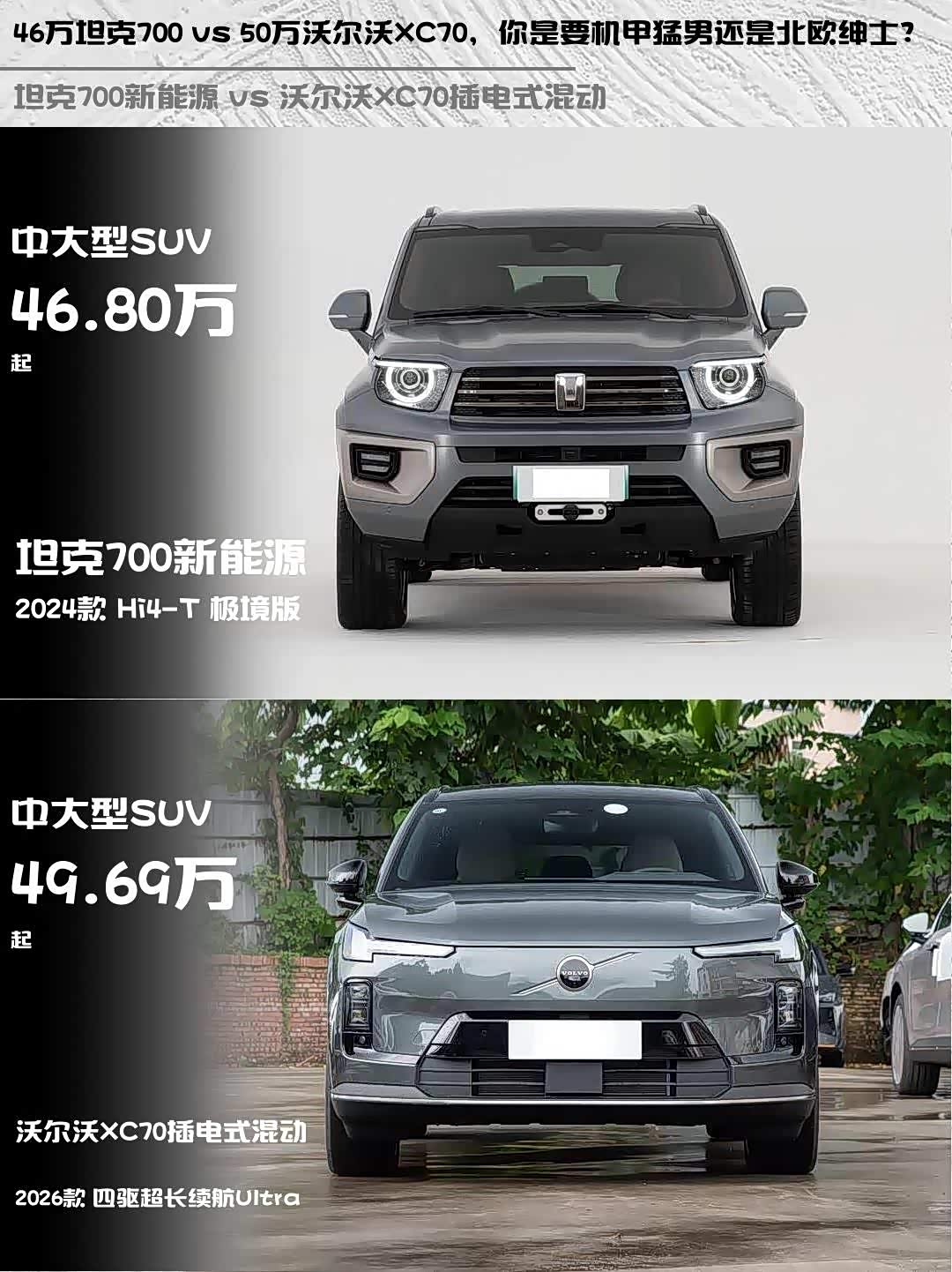 最近深度试驾了两款热门插混SUV——坦克700新能源 2024款 Hi4-T 极境版和 沃尔沃XC70插电式混动(参数|询价) 2026款 四驱超长续航Ultra,发现它们完全是两种性格的选手!🤔