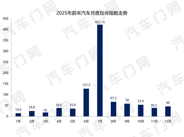 从月度走势来看,蔚来汽车的单月投诉指数多维持在两位数区间,整体呈现低位平稳波动态势,仅在6月和7月出现明显异动,投诉指数大幅攀升。这其中,蔚来汽车7月投诉指数达到了422.15,占比45%。