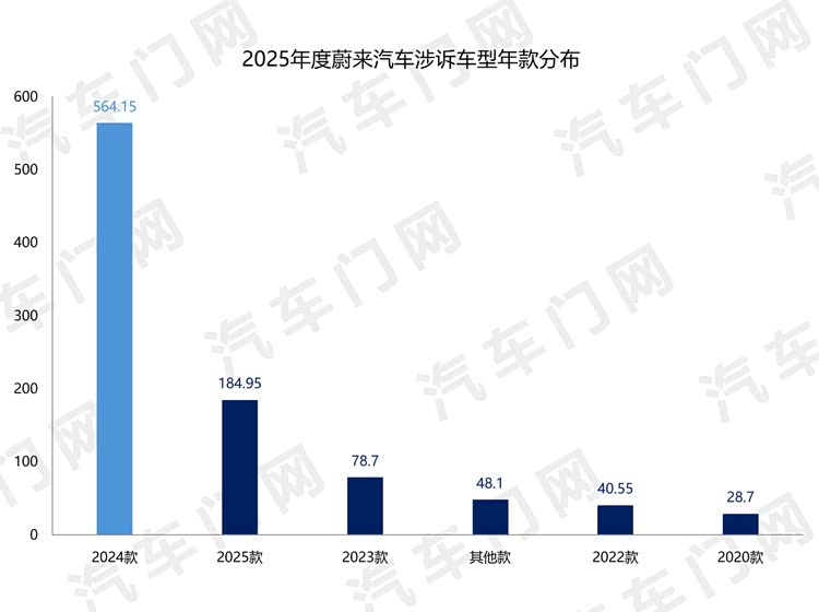从投诉年款来看,2024款车型是蔚来汽车投诉的“重灾区”,占其整体投诉指数的60%。2025款车型的投诉指数达到184.95,占比20%,同样有大量车主进行投诉。其余年款车型的投诉指数均不足80。