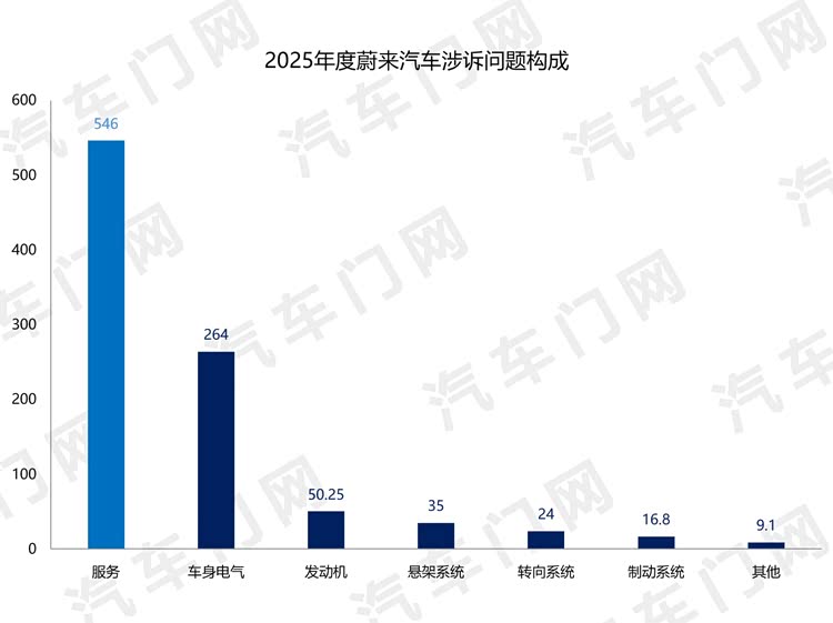 与众多车企相同,蔚来汽车的重点投诉也集中在服务和车身电气两大问题上。其中,服务投诉指数达到了546,占蔚来汽车整体投诉指数的58%。车身电气的投诉指数占比28%。
