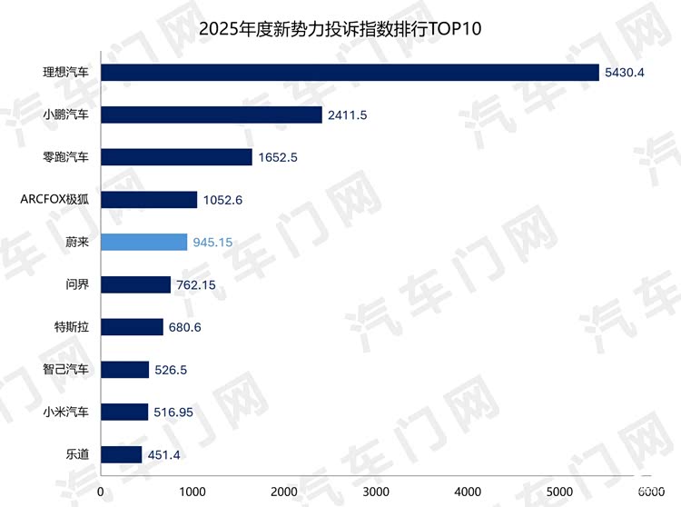 来自汽车门网的数据显示:2025年,蔚来汽车的投诉指数达到了945.15,同比涨超2倍,位居新势力投诉指数排行的第五名。